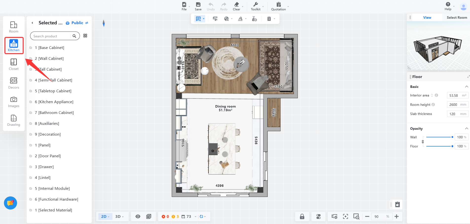 С практической точки зрения библиотека в Coohom хороша тем, что она завязана не только на размещение, но и на дальнейшую настройку. Объект можно переставлять, масштабировать, вращать, блокировать, открывать в 3D, менять материал, а в некоторых кастомных шкафных сценариях даже открывать дверцы одним нажатием, чтобы видеть внутреннюю структуру. Это не просто декоративная функция: в кухне и хранении она позволяет проверить удобство и логику наполнения.