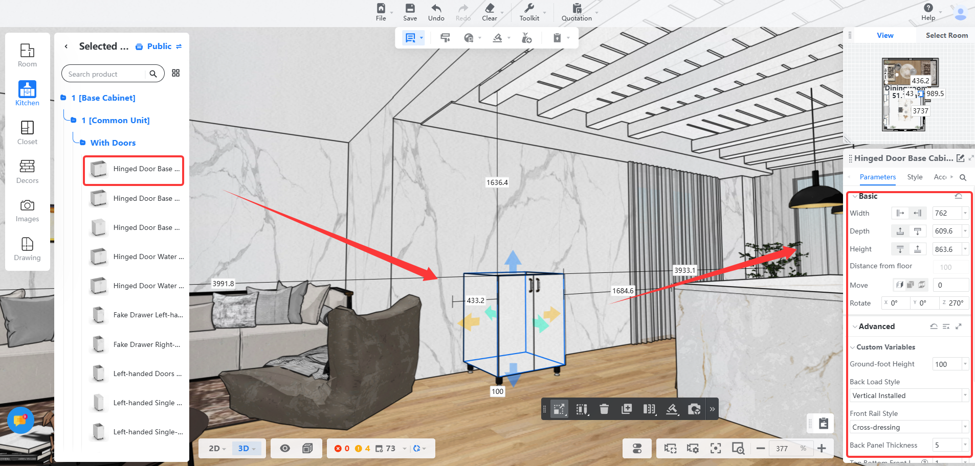 Parameters panel — второй ключевой элемент. Именно здесь Coohom превращается из визуальной игрушки в рабочий инструмент: размеры, привязки, стили, конструктивные и внешние параметры меняются сразу и прямо по объекту. Для кухни это критично, потому что именно на параметрах ломается большинство упрощенных сервисов. В Coohom этот вопрос проработан хорошо: корпус, фасад, ручки, положение, отступы и другие характеристики редактируются без ощущения, что система воюет с пользователем.