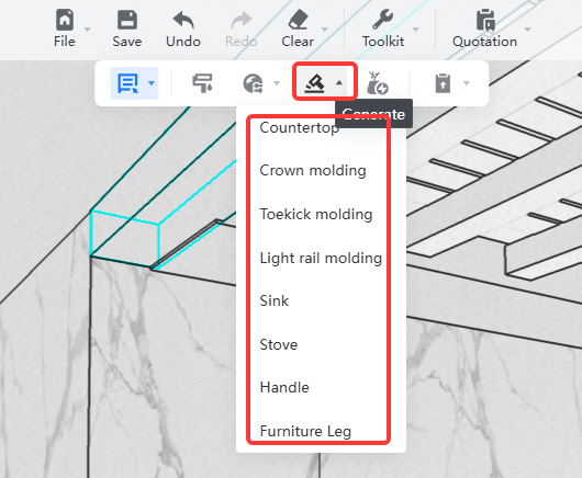 Одна из лучших функций в кухонном режиме — Generate. Вместо того чтобы отдельно достраивать вспомогательные элементы, Coohom позволяет одним действием сгенерировать countertop, crown molding, toekick molding, sink, stove, handle, furniture leg и другие связанные компоненты. На практике это значит, что кухня быстрее становится похожей на законченное решение, а не на полуфабрикат из корпусов.