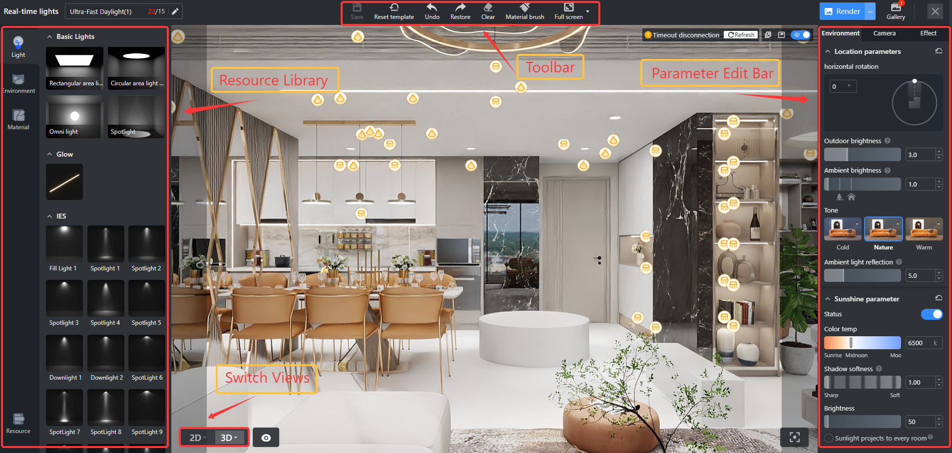 Coohom в real-time режиме позволяет довольно гибко управлять светом. Во вкладке Environment регулируются солнце, ambient light, outdoor brightness, tone и связанные параметры. Помимо этого есть работа с отдельными источниками света: Rectangular Area Light, Circular Area Light, Omni Light, Spotlight, IES Light. Для интерьерного рендера такого набора достаточно, чтобы строить как нейтральную дневную сцену, так и более выразительную вечернюю подачу с акцентными источниками.