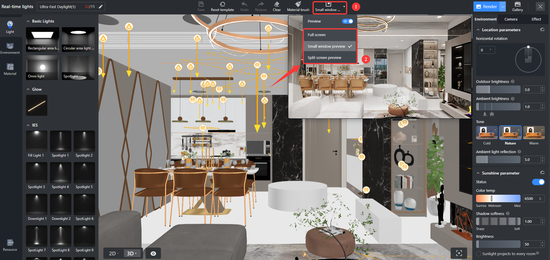 Многие программы обещают быстрый рендер, но по факту там или слабая обратная связь, или слишком ограниченный контроль. В Coohom real-time rendering — это полноценная рабочая среда: шаблоны света, environment, camera, material replacement, effect settings, split/small window preview, lock/unlock и прямой вывод в render/gallery.
