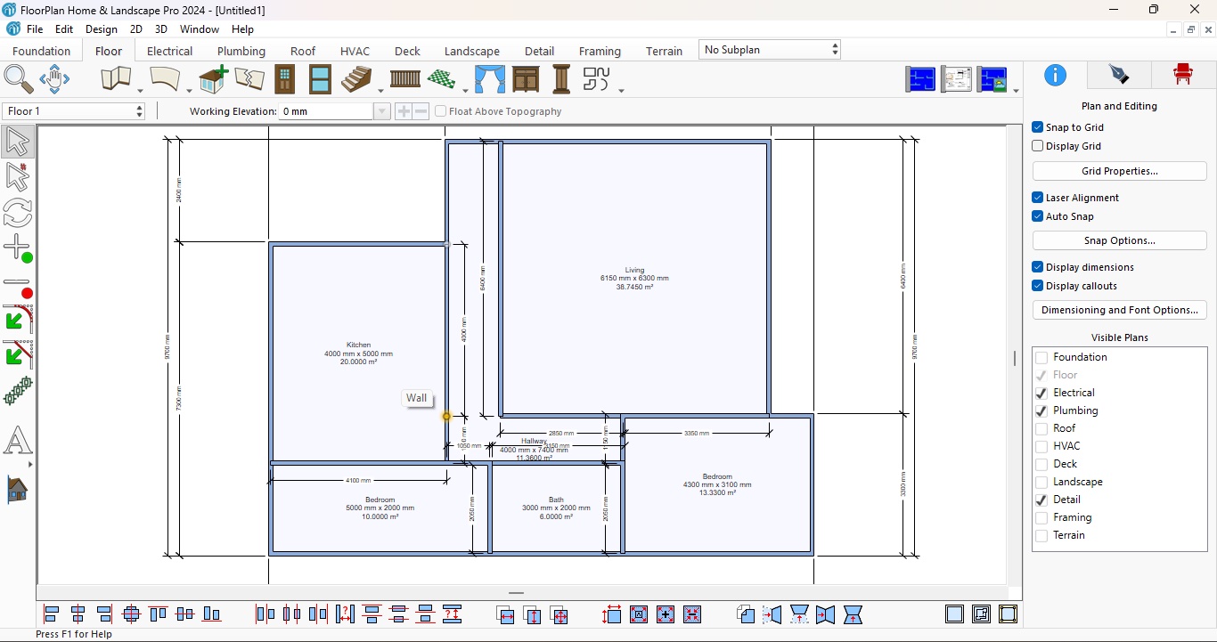 FloorPlan хорошо подходит для детальной доводки уже построенного плана. Объекты, созданные через drag-and-drop или Define 2D Shape, можно перетягивать за точки и сегменты, меняя форму и размеры. При этом программа активно помогает позиционированием: работают Snap to Grid, Auto Snap, Laser Alignment, отображение размеров и callouts. Если нужно, сетка настраивается через 2D menu > Grid Properties, а привязки можно уточнить через Snap Options. В результате даже довольно сложный план дома с коридорами, санузлами, нишами и поворотами собирается без ощущения, что ты борешься с координатами.