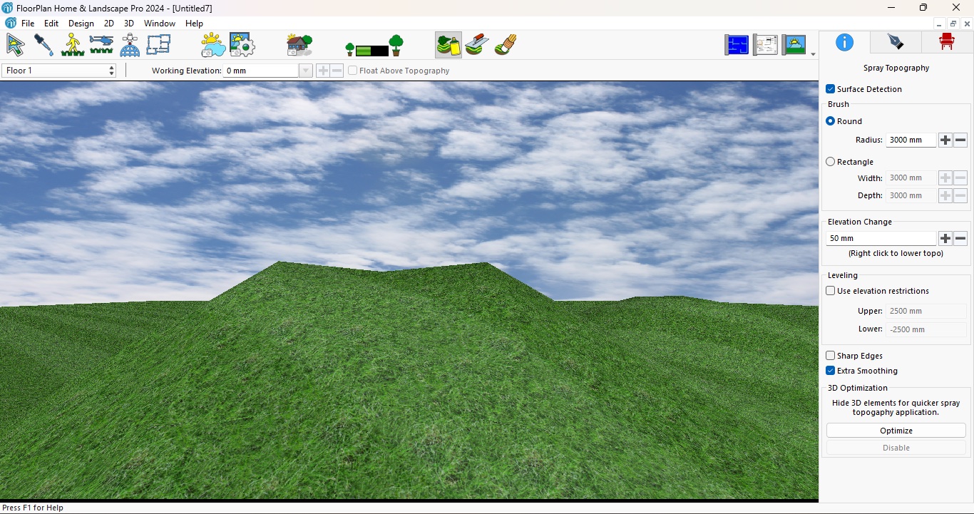 Отдельно надо отметить Spray Topography. FloorPlan позволяет менять рельеф прямо в 3D, а не только через формальные контурные линии. В новых реализациях это сделано через инструменты spray/smooth/erase, где пользователь буквально формирует подъёмы, спуски и плавность рельефа в объёме. Для домов на сложном участке это решающий плюс. Программа перестаёт быть только редактором коробки и превращается в систему, где дом можно посадить на склон, подрезать участок, поиграть с подъездом, дорожками и ландшафтными уровнями.