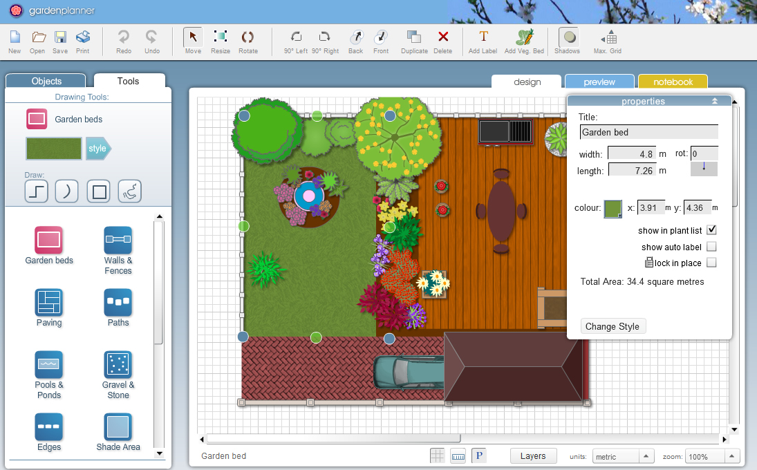 Интерфейс Garden Planner нельзя назвать модным, но его очень легко назвать функциональным. Визуально программа построена по классической настольной схеме: верхнее меню, затем toolbar, слева панели объектов и инструментов, в центре сетка проекта, справа — свойства выбранного элемента, а сверху над рабочей областью находятся вкладки design, preview и notebook. Это старый, но очень удобный формат для программы такого класса, потому что всё главное видно сразу и не приходится постоянно искать команды по скрытым меню.