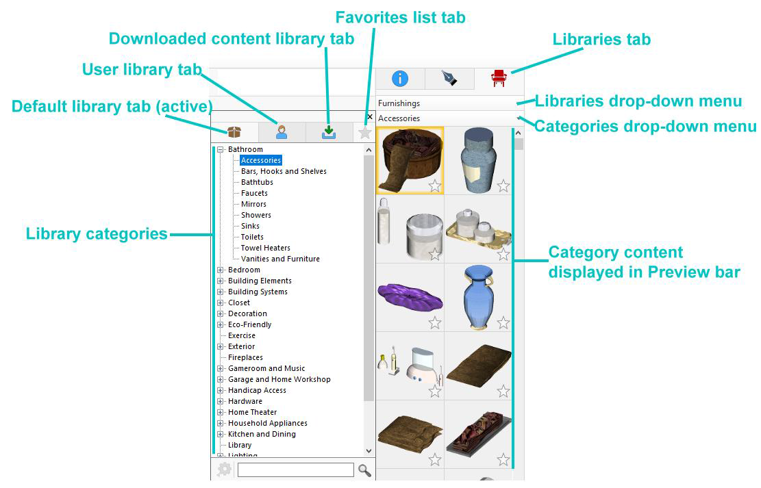 Вторая важная часть интерфейса — Libraries tab. Здесь собраны Stock Library, User Library, Downloaded Library и Favorites. Внутри — категории мебели, отделки, объектов, trim, paint colors, растений, 2D symbols и других библиотечных сущностей. Ниже работает Preview Bar: выбранная категория сразу показывает карточки содержимого, которое можно перетаскивать в проект drag-and-drop.