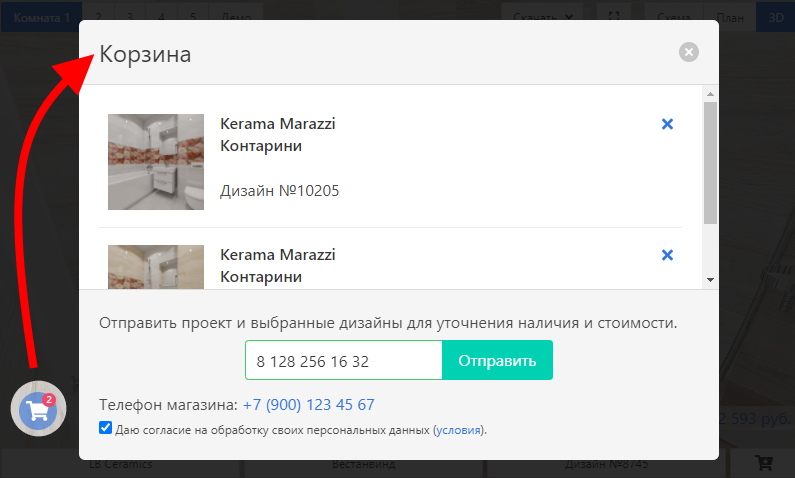 Ещё один важный узел — область Отправить. Здесь программа предлагает отправить проект и выбранные дизайны для уточнения наличия и стоимости. В форме выводятся Телефон магазина, поле Телефон покупателя и чекбокс согласия на обработку персональных данных. Это уже не декоративная часть интерфейса, а реальный переход из режима проектирования в режим коммуникации с продавцом.