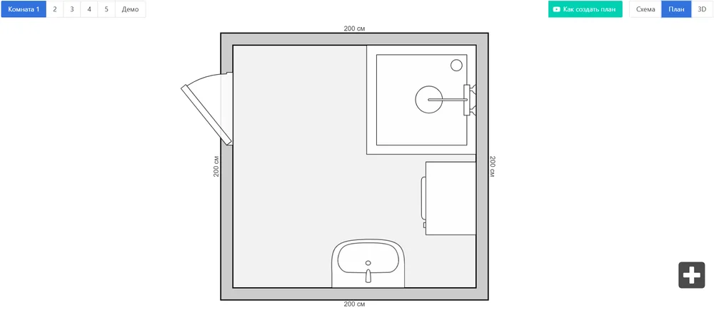 Программа позволяет нарисовать собственное помещение через режим Нарисовать комнату. Для корректной работы нужна замкнутая схема помещения и размеры стен. При этом предусмотрен понятный диапазон габаритов: от 50 до 1000 сантиметров. Для небольших и средних санузлов этого более чем достаточно.