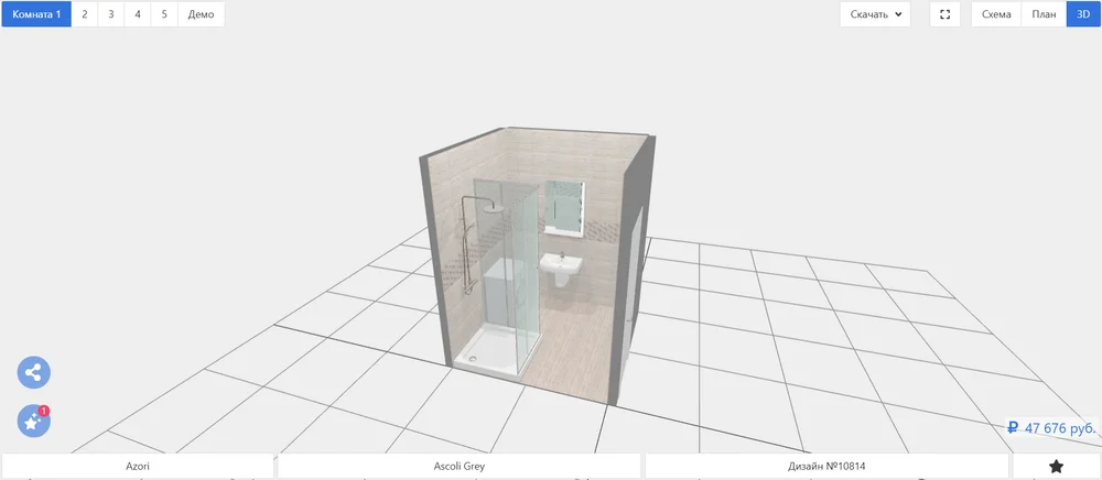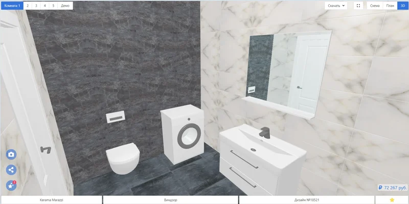 Пользователь переключается между режимами Схема и План 3D, чтобы увидеть помещение либо в плоскости, либо в объеме. Это очень удобно в практической работе: сначала проще проверить геометрию комнаты на схеме, а потом перейти в 3D и оценить общий вид интерьера, сочетание плитки, сантехники и пропорций помещения.