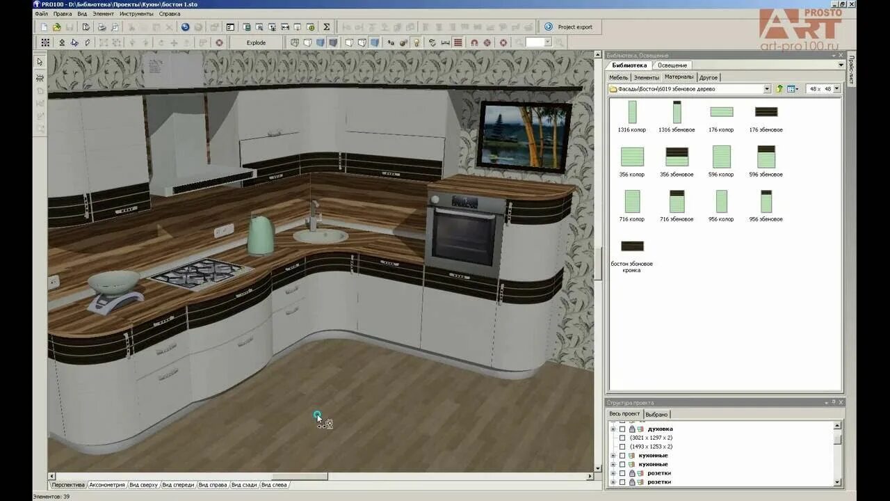PRO100 отвечает на это другой силой. Она проще по базовой логике, быстрее в прямой работе с кастомной корпусной мебелью и очень удобна там, где проект приходится постоянно перестраивать под нестандартный размер, менять модульную композицию, быстро назначать материалы и сразу получать перечни деталей и стоимость. Иначе говоря, KitchenDraw чуть сильнее как витрина и брендовый шоурум, а PRO100 сильнее как рабочая мебельная программа для повседневного проектирования.