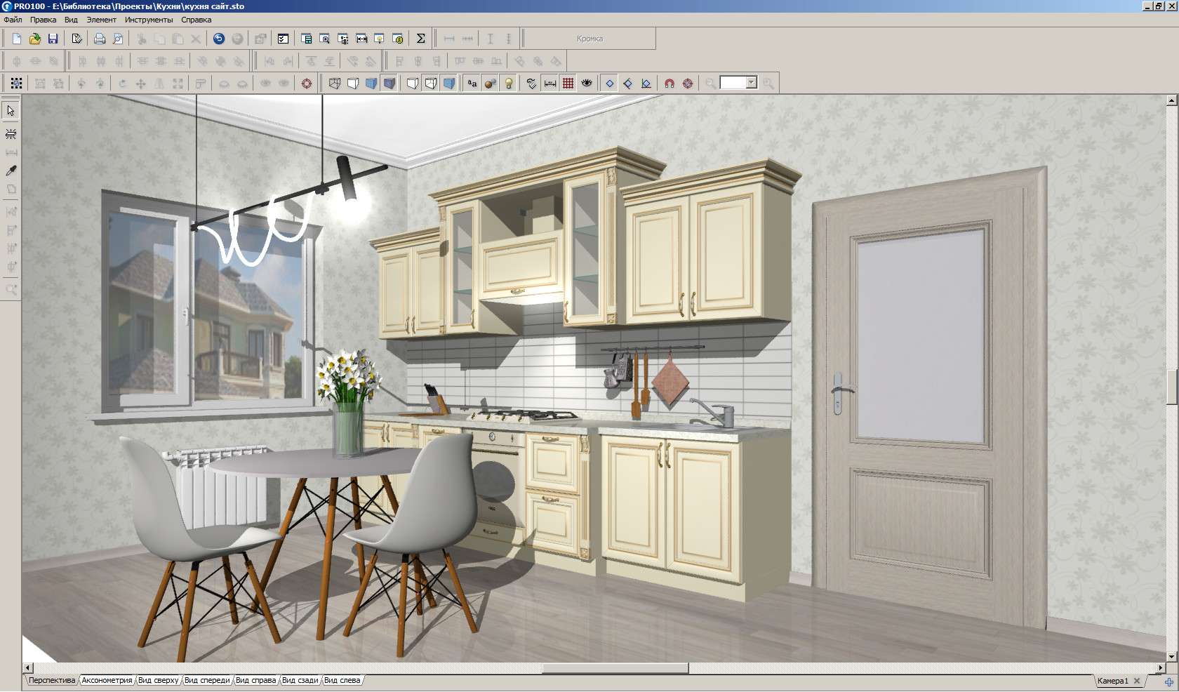 Мгновенная визуализация — одна из самых удачных сторон PRO100. Переключение между перспективой, планом и фасадами, работа в Textures, быстрые замены материалов, полупрозрачность и размерные виды делают программу сильным инструментом именно для согласования проекта. Она хорошо подходит для ситуаций, когда клиент просит показать, как будет выглядеть, а затем тут же хочет прибавить один шкаф, поднять антресоль, сменить фасад или сделать колонну уже.