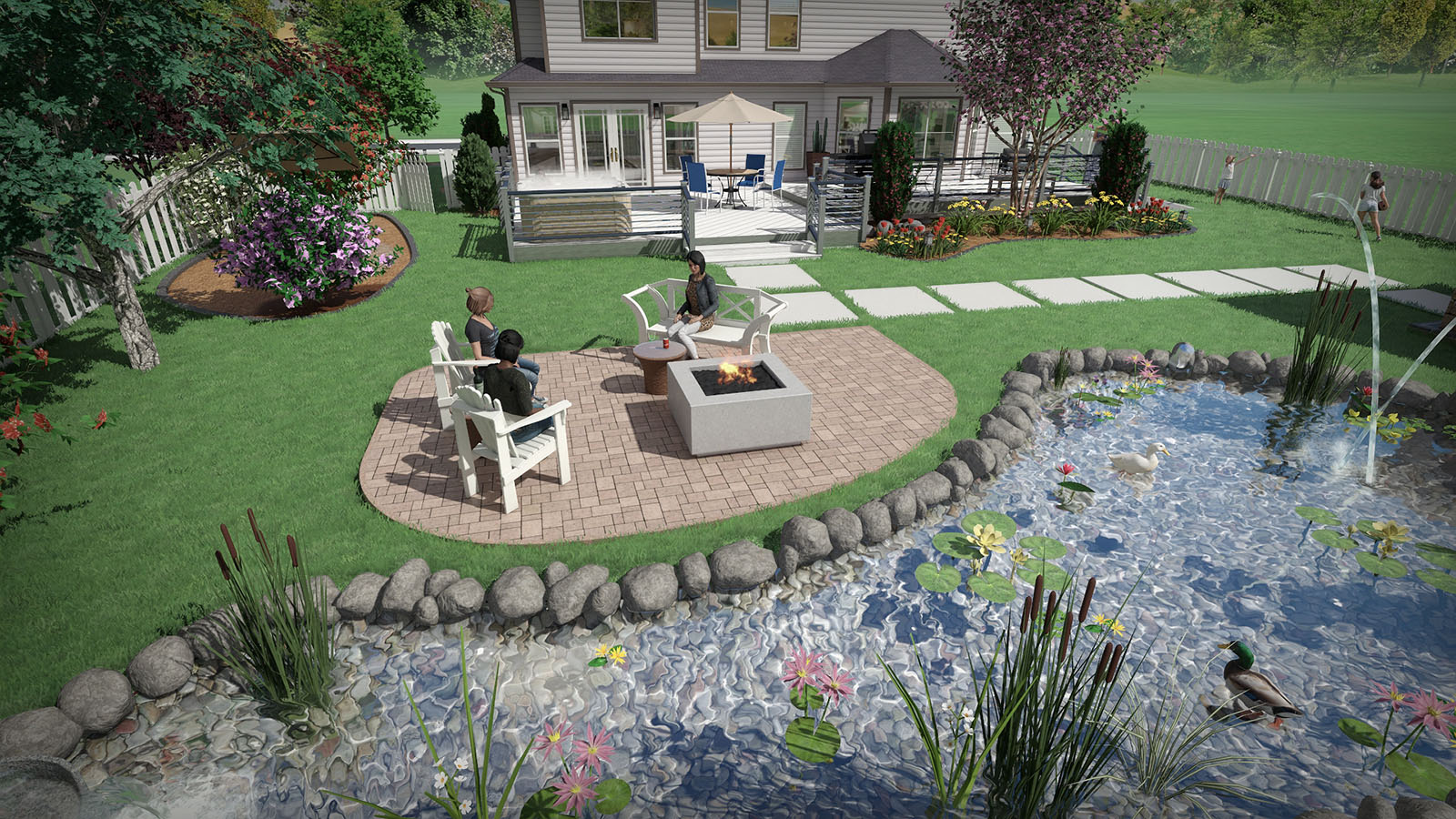 Realtime Landscaping Architect заметно сильнее большинства бытовых планировщиков именно на теме воды. В программе хорошо реализованы пруды, ручьи, водопады, fountains, jumping jets, rockery и декоративные аксессуары для водных зон. Важнее другое: вода здесь не выглядит мёртвым синим полигоном. При walkthrough и 3D-презентации в ход идут течение, отражения, ripples, рыбы и общая атмосферность сцены.