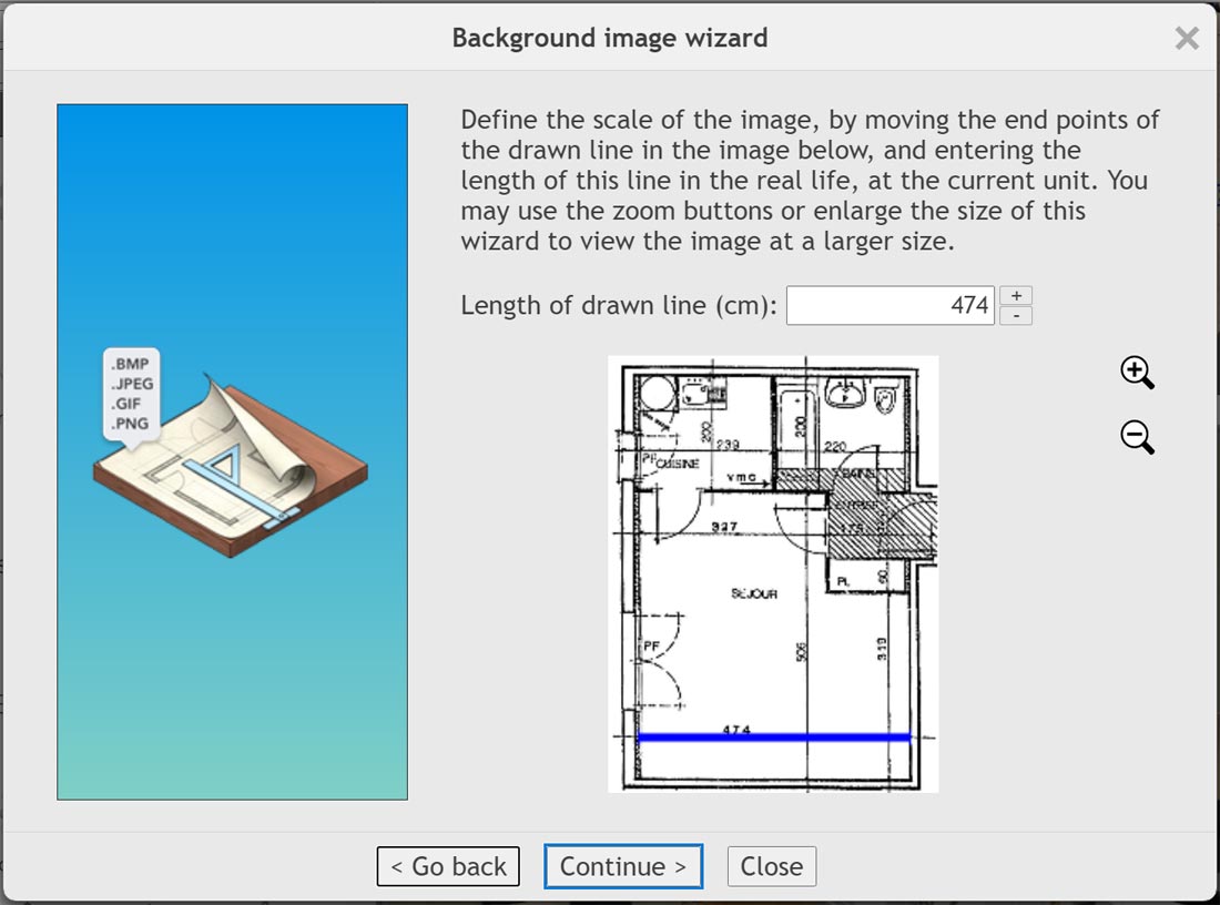 Если у вас есть план БТИ, скан старого чертежа, набросок от застройщика или даже просто понятная схема помещения, Sweet Home 3D Online позволяет использовать её как фон. Для этого служит команда Plan > Import background image…. Дальше открывается wizard, где нужно: