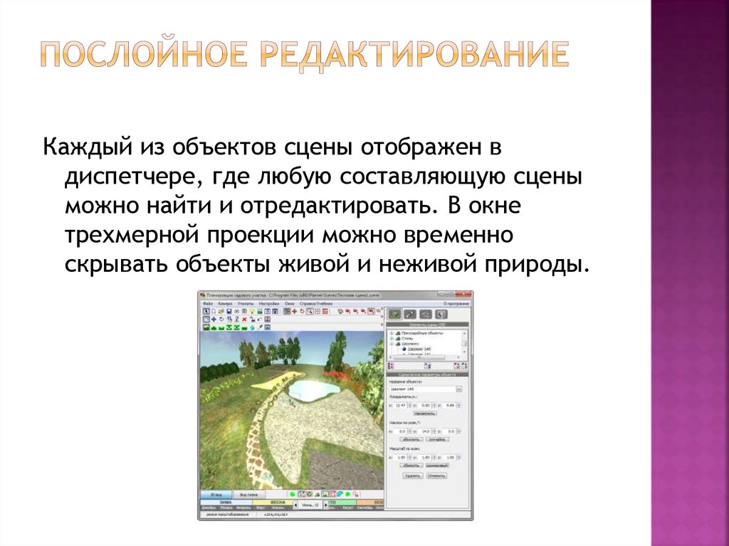 В основе X-Designer лежит принцип трехмерного редактора с библиотечным наполнением. Пользователь не строит территорию примитивами вручную и не моделирует каждый объект отдельно. Он заполняет пространство готовыми объектами из многочисленных библиотек, меняет их размеры, цвет, текстуры и относительное положение частей. За счет этого программа очень быстро дает результат, а вход в нее намного проще, чем в полноценные универсальные 3D-редакторы.