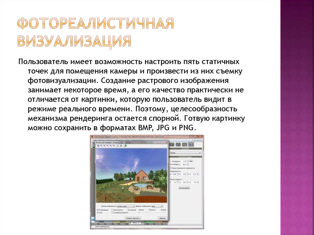 Окно Финальный рендеринг вызывается через меню Утилиты. Для итогового изображения можно включать сглаживание, тени и анизотропию, а также настраивать уровень резкости ползунком. После этого картинка сохраняется в форматах BMP, JPEG или PNG через кнопку Создать картинку. Набор настроек не выглядит огромным, но для программы, предназначенной именно для визуализации участка, этого вполне достаточно.