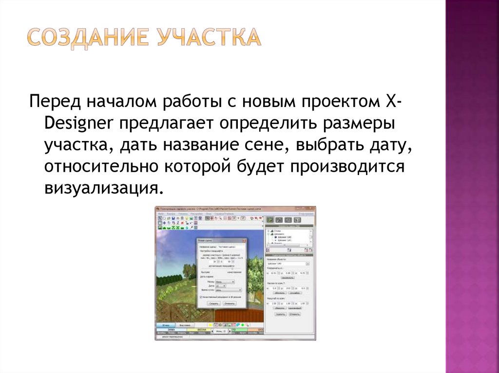 Когда в X-Designer создается новый проект, программа запускает Мастер новой сцены. Это важный элемент интерфейса, потому что именно здесь задается стартовая логика будущего проекта: размеры участка, дата, время суток для трехмерного изображения и уровень детализации. Для программы такого класса это грамотное решение: пользователь получает не пустую абстрактную сцену, а сразу проект с заданными рамками, что особенно удобно при планировке конкретного дачного участка.
