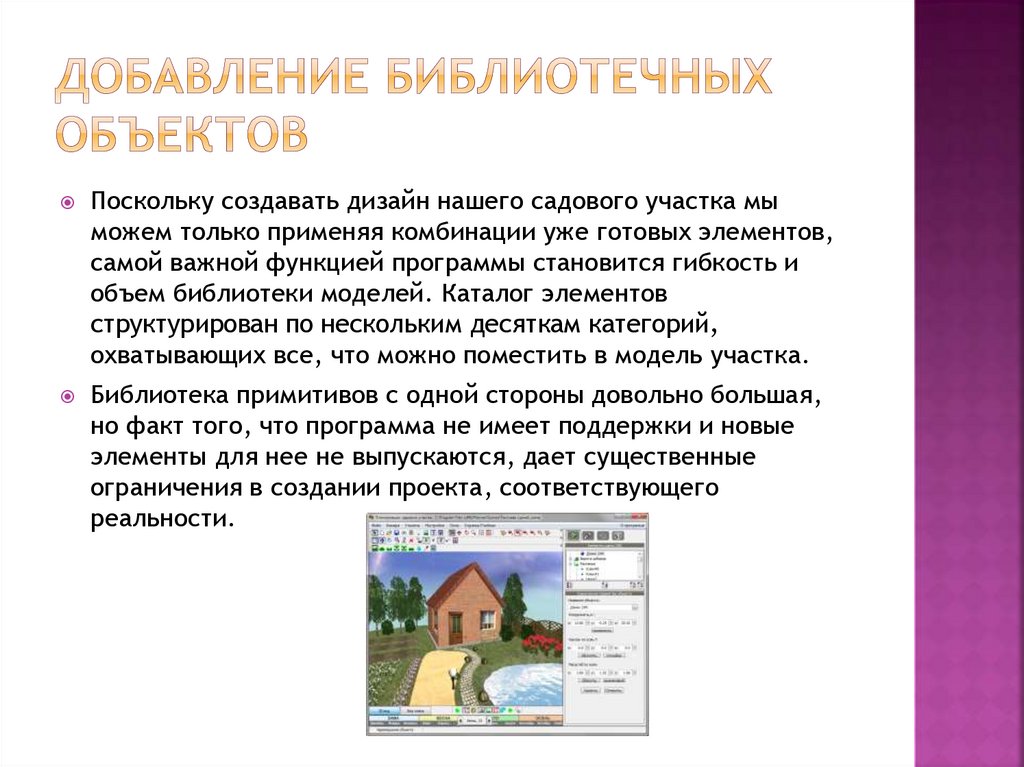В разделе Библиотеки находятся модели дачных домиков, бассейнов и других объектов оформления участка. В материалах по программе отдельно отмечаются также беседки, фонари, фонтаны, скамейки, декоративные камни и другие детали благоустройства. Это как раз тот набор, который нужен не для архитектурного проектирования дома с нуля, а для компоновки живого дачного пространства.
