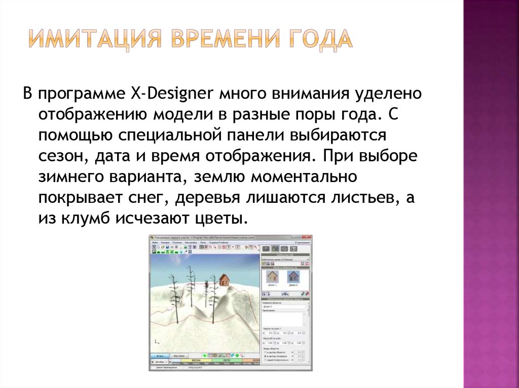 В X-Designer эта часть реализована не как второстепенный эффект. При зимнем варианте земля покрывается снегом, деревья лишаются листьев, клумбы меняют вид. При изменении времени суток можно наблюдать движение теней от построек и деревьев. Это означает, что пользователь оценивает не просто схему объектов, а поведение участка во времени. Для дачного и садового планирования такая функция очень практична.
