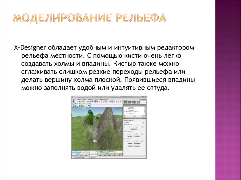 Редактор рельефа в X-Designer нельзя назвать декоративным. Он действительно помогает формировать пластику территории, создавать холмы и впадины, заполнять низины водой, сглаживать переходы. Для программы такого класса это одно из самых ценных практических преимуществ.