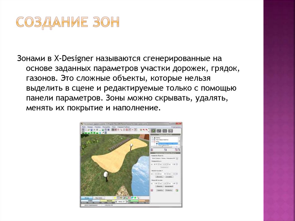 Зоны в X-Designer — это не просто отдельные пятна на земле, а специальные сгенерированные участки для дорожек, газонов, грядок и похожих элементов. Они редактируются через панель параметров, могут скрываться, удаляться, менять покрытие и наполнение. Это важный инструмент, потому что именно через зоны удобно собирать большие функциональные части участка, а не рисовать их вручную разрозненными объектами.