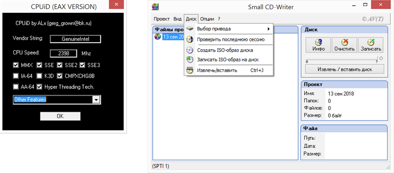 | Интеграция с Проводником | Файлы можно отправлять в проект через пункт Отправить на Small CD-Writer |