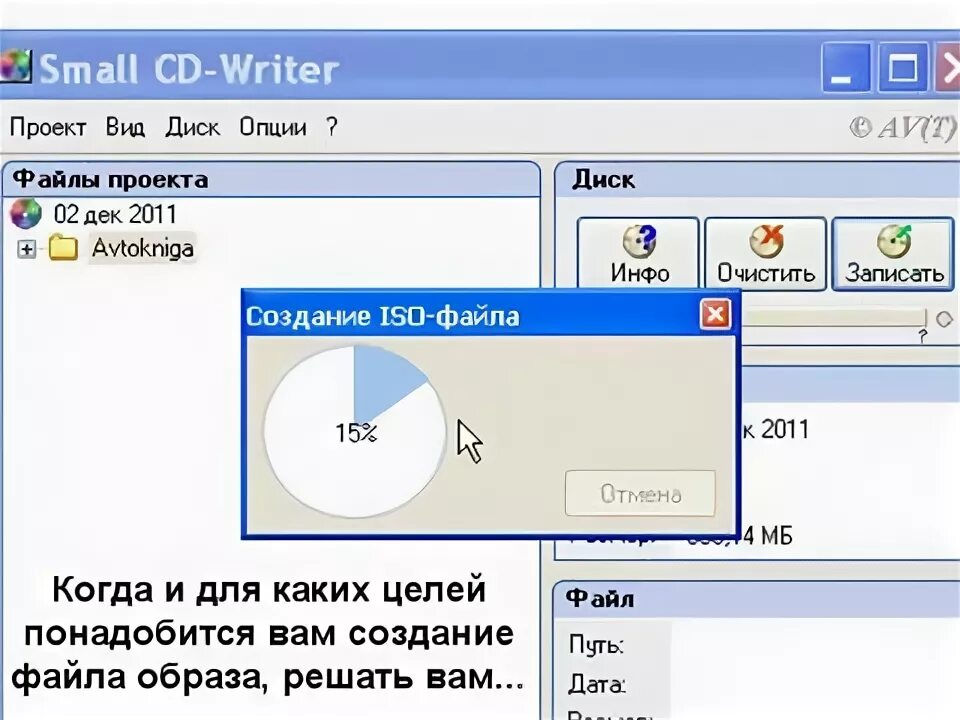 Отдельный сценарий — сохранение не физического диска, а именно текущего проекта в ISO-образ. Это делается через окно Запись диска, где среди режимов есть пункт Записать проект в файл ISO-образ диска. В этом случае Small CD-Writer не прожигает данные сразу на болванку, а формирует образ из собранного набора файлов и папок. Такой подход удобен, когда сначала нужно подготовить результат в ISO, а запись выполнить позже.