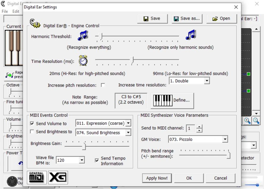 Окно Settings — место, где становится понятно, что Digital Ear ориентирован не на массового пользователя нажал кнопку и забыл, а на того, кто готов немного вникнуть в механику распознавания. Здесь находится Digital Ear Engine Control с несколькими действительно важными параметрами: Harmonic Threshold, Time Resolution (ms), Note Range, флажки и маршрутизация для Send Volume to и Send Brightness to, параметр Brightness Gain, BPM для wave-файла, выбор MIDI-канала, GM-голоса и диапазона pitch bend. Все это не декоративные опции, а реальные рычаги качества результата.