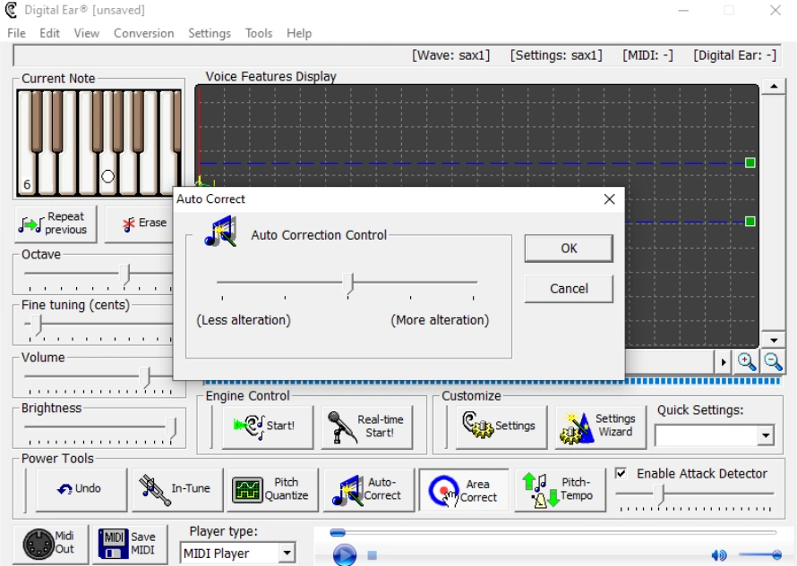 Это один из самых недооцененных плюсов программы. После первичного анализа можно не сразу выносить результат во внешний секвенсор, а сначала попробовать привести его в порядок внутри самого Digital Ear. Для этого и служат Undo, Pitch Quantize, Auto-Correct, In-Tune, Area Correct, а также общий контроль через регуляторы высоты, громкости и яркости.