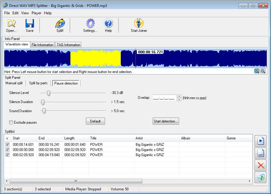 Вкладка Pause detection в Direct WAV MP3 Splitter сделана максимально прикладной. Здесь есть параметры Level, Duration, Overlap, флажок Exclude pauses, кнопка Default и кнопка Start detection.... И этого набора действительно достаточно для реальной работы. Level задает, что считать тишиной по уровню сигнала. Duration определяет, насколько длинной должна быть тишина, чтобы программа восприняла ее как границу между фрагментами. Overlap позволяет добавить перекрытие между соседними частями, а Exclude pauses — исключить сами паузы из итоговых файлов. За счет этого Direct WAV MP3 Splitter пригоден не только для грубого автоделения, но и для аккуратной подготовки материала к прослушиванию.