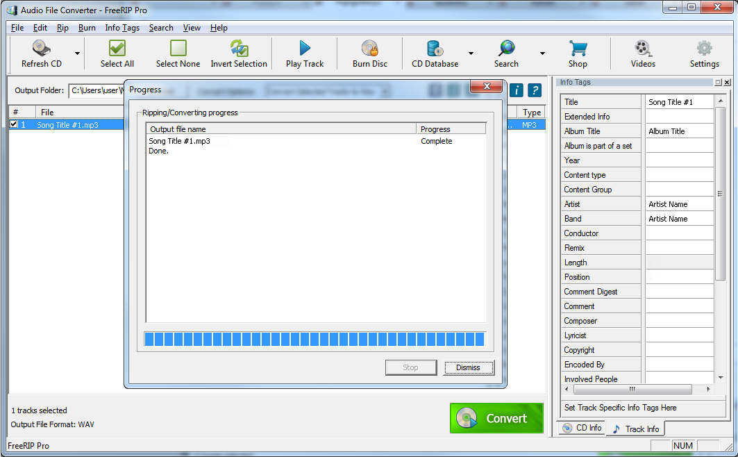 Окно прогресса здесь работает так же, как в риппинге CD: FreeRIP показывает ход обработки, а завершение отмечает статусом Done. Это делает программу пригодной не только для единичной конвертации, но и для пакетной обработки десятков или сотен файлов. В Pro-версии к этому добавляются Concurrent Conversions, режим повышенного приоритета и оптимизация под multi-core, что ускоряет большой объём задач.