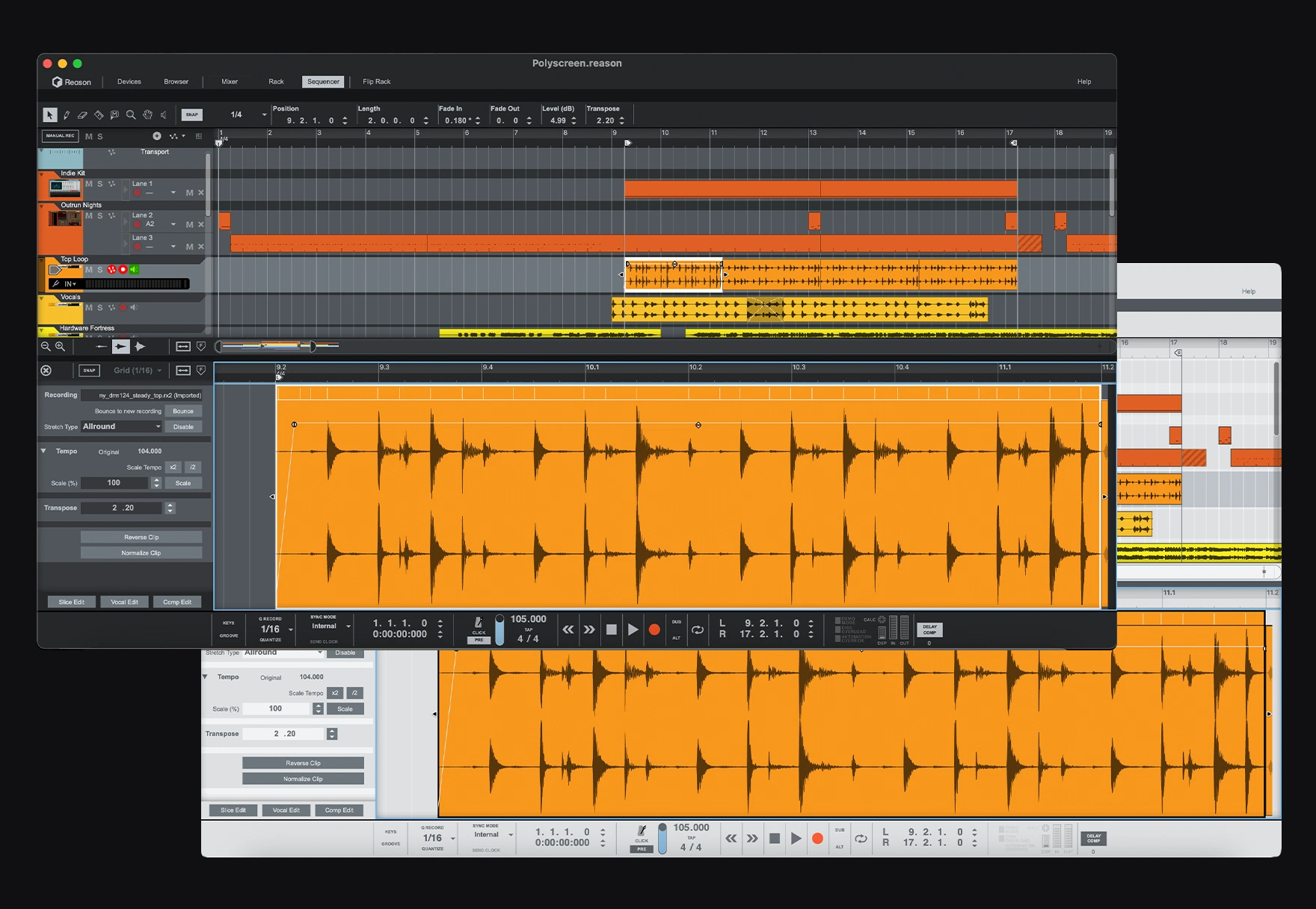 Reason уверенно закрывает задачи записи аудио. Когда вы создаёте Audio Track, программа добавляет и соответствующее rack-устройство, и канал в Main Mixer, и трек в Sequencer. Само редактирование аудио уже давно не выглядит здесь второстепенной функцией. В аудиоклипах можно подрезать начало и конец, делать fade-ы, нормализацию, reverse, изменять темп, транспонировать, квантизовать аудио, двигать slice-маркеры, а в многотейковых записях собирать лучший дубль через comp-логику. Для моновокала предусмотрен отдельный Vocal Edit mode с коррекцией высоты.