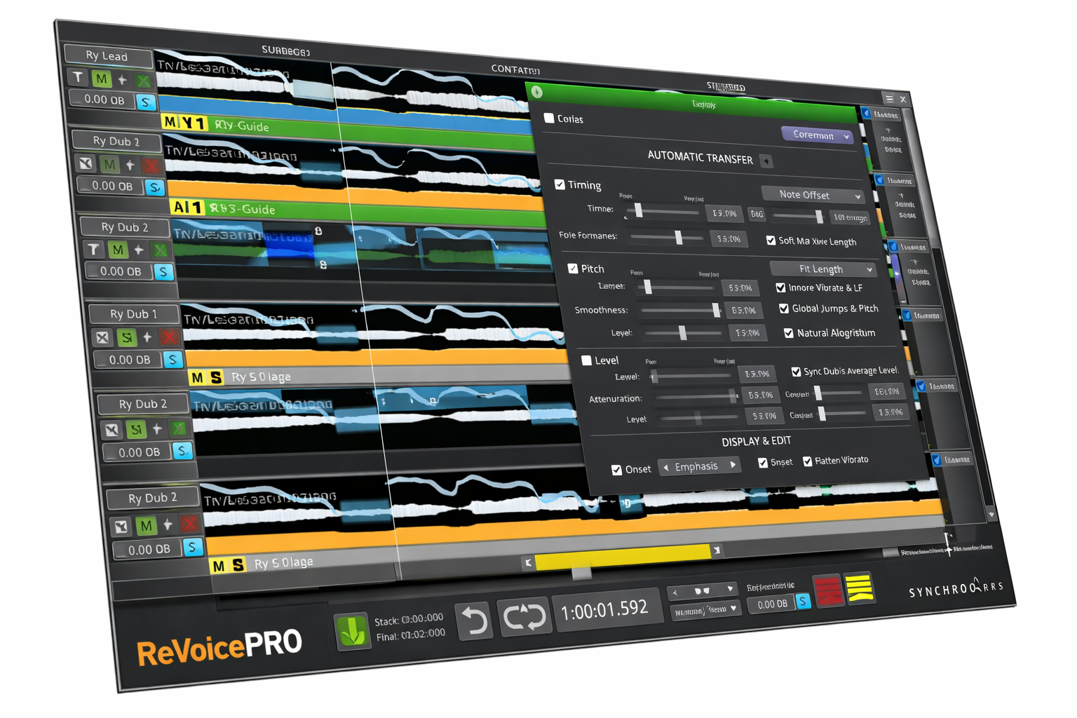Главная сила Revoice Pro в том, что он работает не только по принципу поправить фальшивую ноту. Программа умеет переносить с одной дорожки на другую тайминг, pitch, vibrato и loudness, причем делает это с привязкой к реальной форме исполнения: атакам, окончаниям, внутренней динамике, вибрато и переходам между слогами. За счет этого Revoice Pro особенно полезен там, где обычной коррекции недостаточно: в плотных вокальных стеках, при сведении дублей к одному лидовому исполнению, при подгонке гармоний, а также в ADR и дубляже, где нужно не просто попадание в ноты, а совпадение по ритмике и инфлекции.