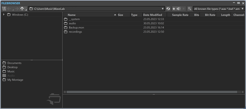 WaveLab Pro хорошо раскрывается, когда пользователь начинает пользоваться не только главным окном, но и вспомогательными инструментами. Окно File Browser позволяет перемещаться по папкам, включать Auto Play Mode, слушать файл через Master Section и быстро фильтровать отображаемые форматы. В студийной работе это сильно ускоряет прослушивание исходников, референсов и промежуточных рендеров.
