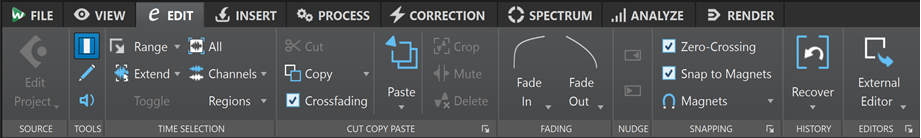 Во вкладке Edit для Audio Montage вынесены ключевые команды: Edit Source, Range, Extend, операции удаления, подрезки, ripple-поведение, авто-группировка, режимы crossfading, Snap to Magnets, Magnets, вызов Waveform Editor, Spectrum Editor и External Editor. Это очень удобная раскладка: монтаж редактируется в контексте таймлайна, но в любой момент можно открыть исходник клипа в Audio Editor и перейти к более детальной правке.