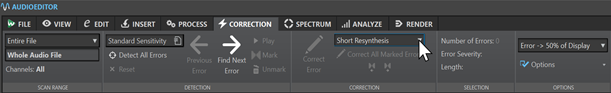 Если в Process собраны осознанные вмешательства в материал, то Correction — это зона, где WaveLab Pro разбирается с дефектами. В этой вкладке есть Scan Range, система пресетов детекции, команды Detect All Errors, Reset, Previous Error, Find Next Error. Логика очень взрослая: сначала вы определяете, что именно считать ошибкой и в каком диапазоне искать, затем строите карту проблемных мест, а уже после этого переходите к точечной правке.