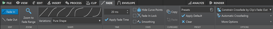 Для работы с переходами у WaveLab Pro есть отдельная вкладка Fade. В ней доступны переключение между Fade In и Fade Out, Zoom to Fade Range, выбор формы кривой, опции компенсации амплитуды, время fade, скрытие точек кривой, блокировка fade-in/fade-out, smoothing и настройки автоматического crossfading. Это не набор примитивных линейных фейдов, а действительно полноценный блок управления переходами.