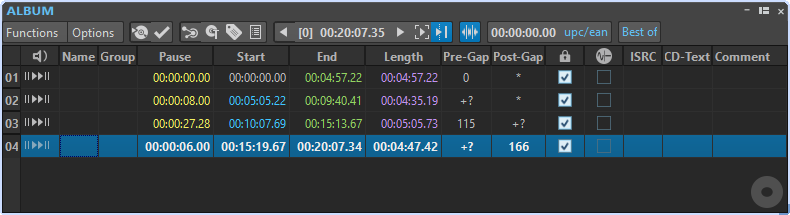 Основной инструмент для этой стадии — Album window. В нем отображается список титулов и ключевые параметры: Name, Group, Pause, Start, End, Length, Pre-Gap, Post-Gap, флаг Lock, ISRC, CD-Text, комментарии и другие сведения. Title можно переупорядочивать drag-and-drop, а выбор клипа в монтажном окне подсвечивает соответствующий title в списке. Это именно тот уровень связности интерфейса, который нужен при сборке альбома или EP.