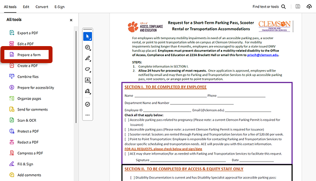 Ниже — пример входа в Prepare a form прямо из панели инструментов: