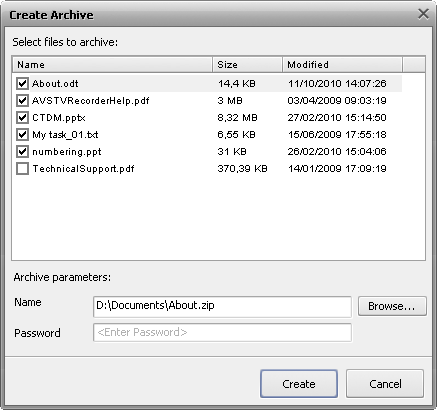 Окно Create Archive в AVS Document Converter.