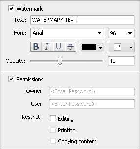 Поддержка text watermark и защиты PDF через Owner, User и Restrict.