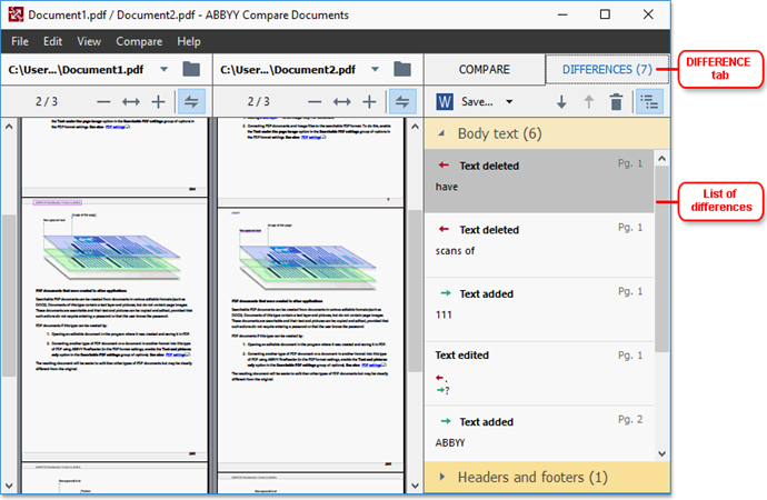 Сравнение PDF документов в ContentReader PDF — это не косметическая опция для галочки, а полноценный отдельный режим работы. Запускается он через Tools > Compare Documents, из отдельного окна задач или через ABBYY/ContentReader Compare Documents. После загрузки двух файлов программа показывает их бок о бок и собирает отличия в правой панели на вкладке DIFFERENCES.