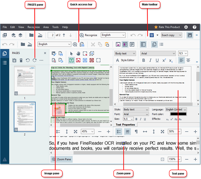 В OCR Editor компоновка еще подробнее: Pages pane отвечает за список страниц, Image pane показывает исходный скан, Text pane — распознанный текст, а Zoom pane дает увеличенный фрагмент строки или области. Такая связка очень удобна, когда нужно проверить, как программа прочитала спорный символ, таблицу, колонку или подпись. В этом же режиме доступны распознавание страниц, анализ областей, проверка текста и ручная коррекция ошибок OCR.