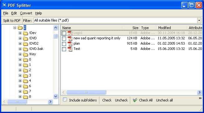 CoolUtils PDF Splitter рассчитан и на одиночный файл, и на пакетную обработку. Внизу центральной панели находятся Include subfolders, Check, Check All, Uncheck All, Restore last selection. Это не декоративные элементы, а реальный рабочий блок для массовой обработки.