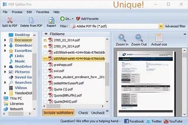 Предпросмотр справа нужен не просто для контроля. Он напрямую влияет на скорость работы: выделили файл в списке — сразу увидели, тот это PDF или нет. Над окном просмотра находятся Zoom In, Zoom Out, Actual size, Fit to width, Whole page. Для работы со сканами, договорами, книгами и отчетами это удобно: перед split PDF по страницам можно быстро оценить структуру документа, плотность пустых листов, наличие штрихкодов или закладок.