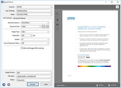 Главное окно Epson Scan 2 с вкладками Main Settings и Advanced Settings, выпадающими списками Scanner, Scan Settings, параметрами документа и кнопками Preview и Scan.
