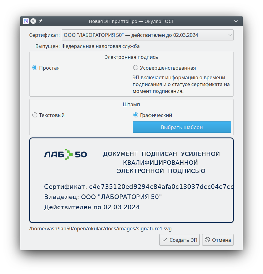 Окуляр ГОСТ позволяет создавать два формата подписи: простую ЭП и усовершенствованную ЭП. Усовершенствованный вариант включает информацию о времени создания подписи через TSP и о статусе сертификата на момент подписания через OCSP. Это важно в сценариях, где надо не просто подписать документ, а сохранить максимум проверочной информации внутри самой подписи. Именно поэтому программа хорошо чувствует себя в профессиональном документообороте, а не только в бытовом поставить росчерк на PDF.