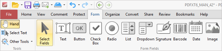 На вкладке Form находится весь основной набор полей: Select Fields, Text, Button, Check Box, Radio, List, Dropdown, Signature, Barcode, Date, Image. Это не символический набор, а вполне полноценный конструктор PDF-форм, в котором можно расставить поля по странице, отредактировать их свойства и довести форму до рабочего состояния.