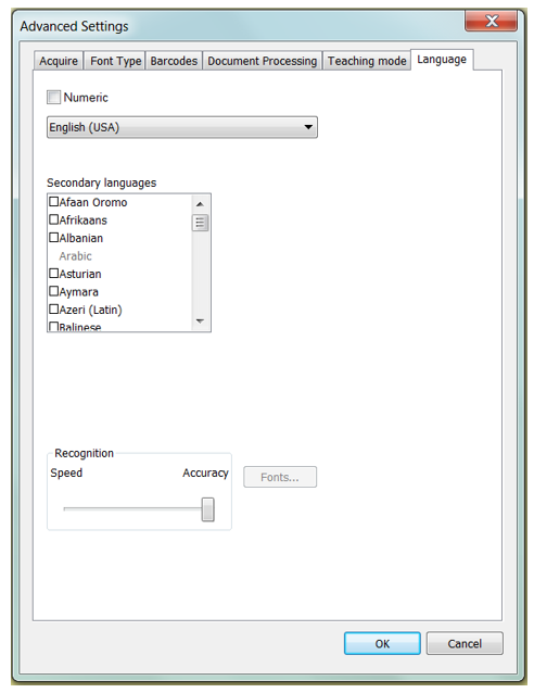 В Advanced Settings можно управлять языком распознавания, вторичными языками и балансом скорости/точности.