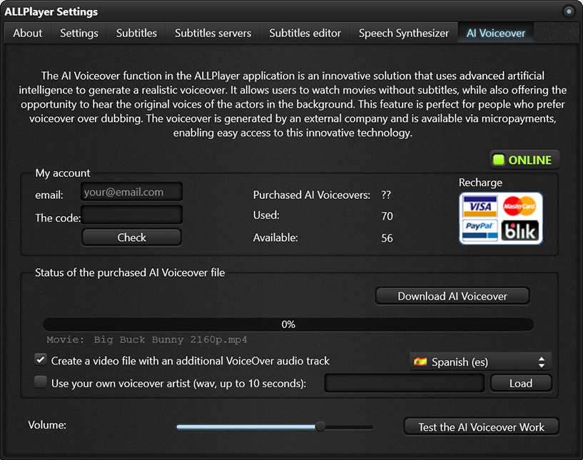 Дальше ALLPlayer открывает ALLPlayer Settings с активной вкладкой AI Voiceover, где ключевые элементы управления уже на месте: