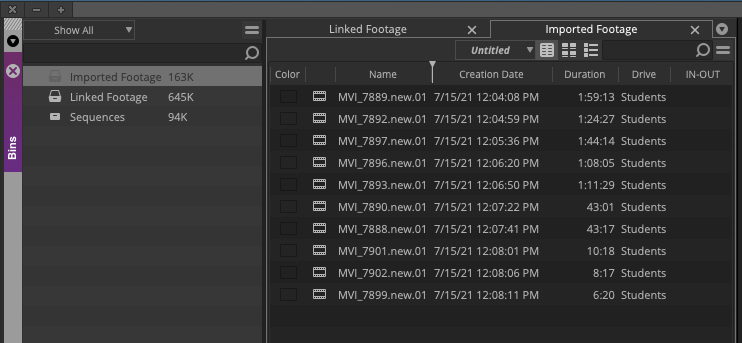Bins — папки-проекты внутри проекта, где живут клипы, сабклипы, секвенции, пресеты, эффекты,