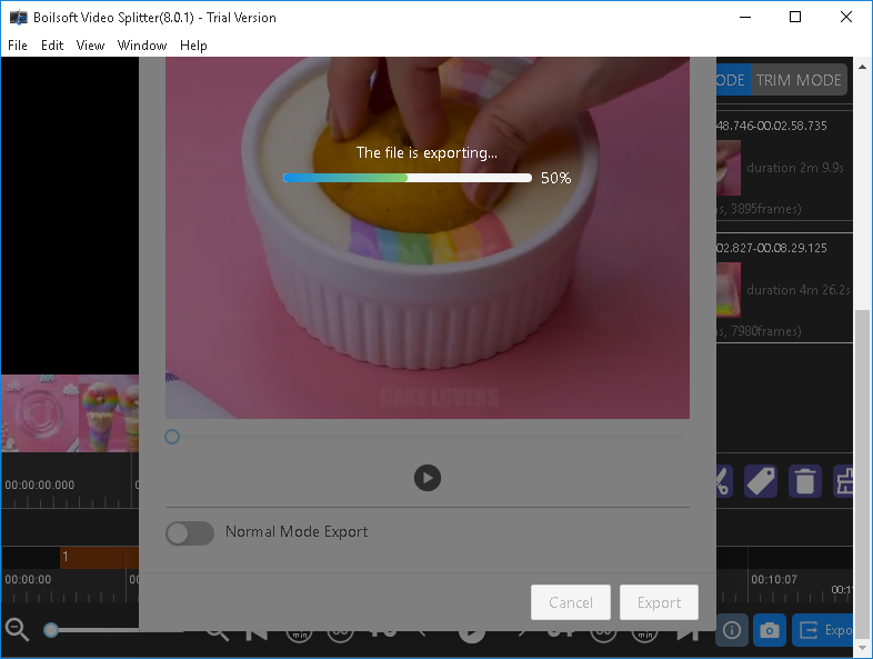 В окне экспорта виден дополнительный переключатель Normal Mode Export, а само действие не размазано по нескольким мастерам и диалогам — пользователь остается внутри одной логики: подготовил сегменты, подтвердил режим, получил файлы.
